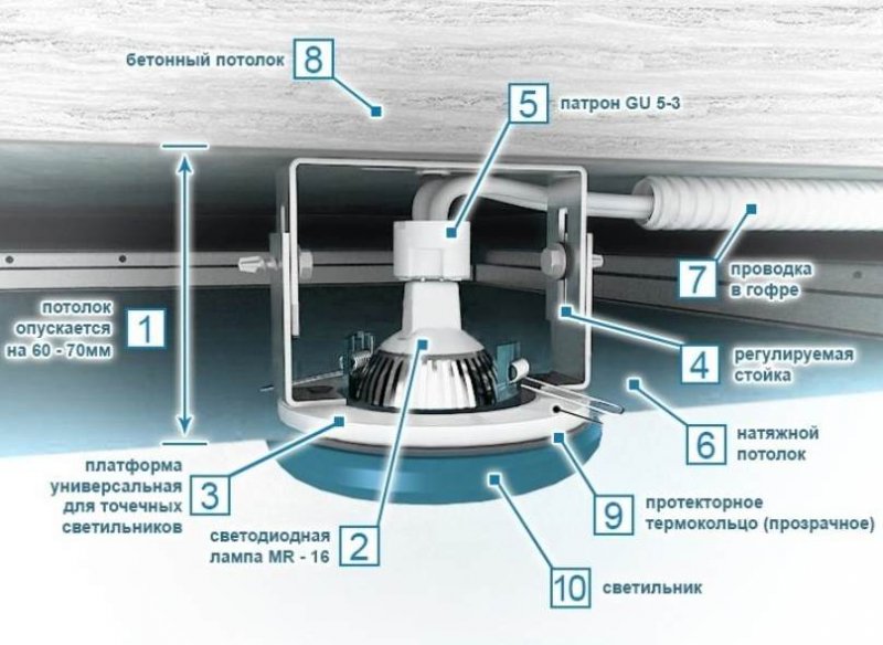 Точечные накладные светильники монтируются на регулируемые стойки, которые устанавливаются до натягивания полотна. Встраиваемые экземпляры образуют с пленкой или тканью единую плоскость, крепятся при помощи крюков или стоек.