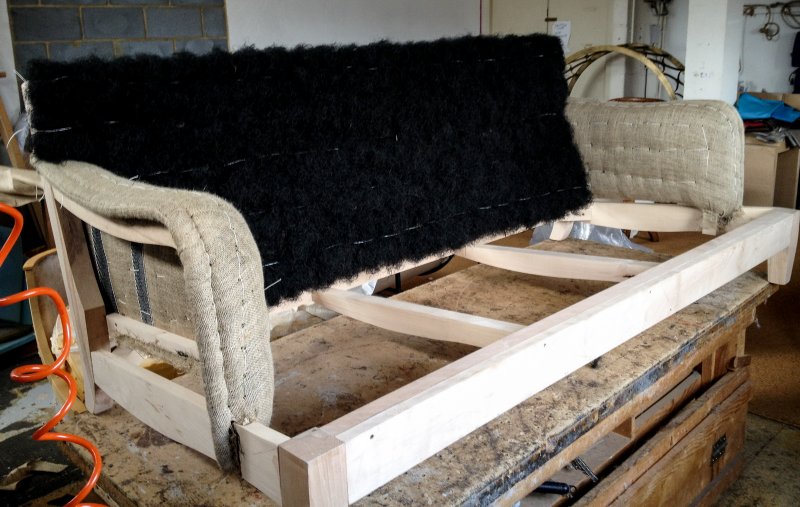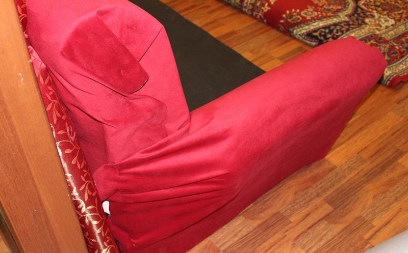 Чехол выкраивается по размерам старой «оболочки», сшивается на машинке. Важно соблюдать припуски на швы. Каждый фрагмент обтягивается индивидуально, место, куда вставляется деталь, маскируется потайным швом, выполненным вручную. Если текстильный материал отличается «сыпучестью», его края обрабатывают оверлоком. Скобы устанавливаются на расстоянии три-пять сантиметров друг от друга.