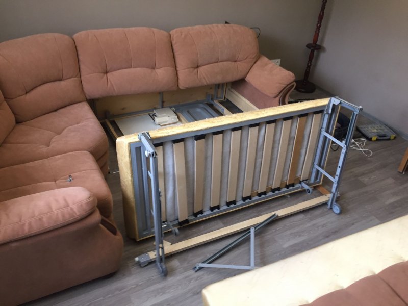 Позднее снимаются сидения, угловые элементы. Если на короткой половине есть спинка, ее снимают, открутив перед этим гайки, которыми сидение прикручено к каркасу. Основание разбирают в последнюю очередь – последовательность действий зависит от того, какой именно механизм трансформации угловой модели.