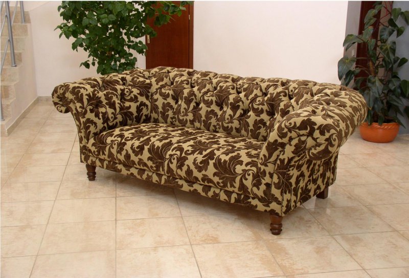 При выборе ткани обращают внимание на визуальные характеристики: цвет, его сочетание с деревянными частями изделия, окружающим фоном. Чем больше обтягиваемый диван, тем крупнее рисунок для него подойдет. Но когда конструкция состоит из множества деталей, имеет большое количество швов, текстиль предпочтителен однотонный.