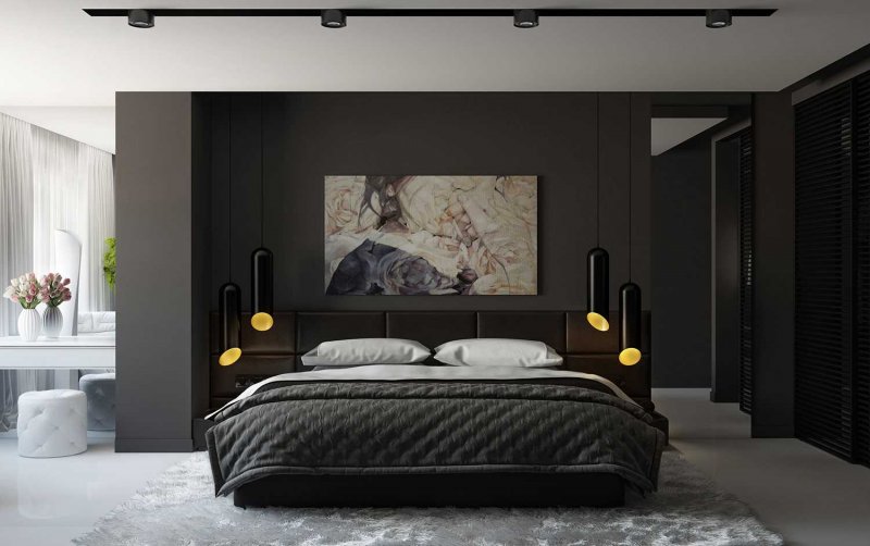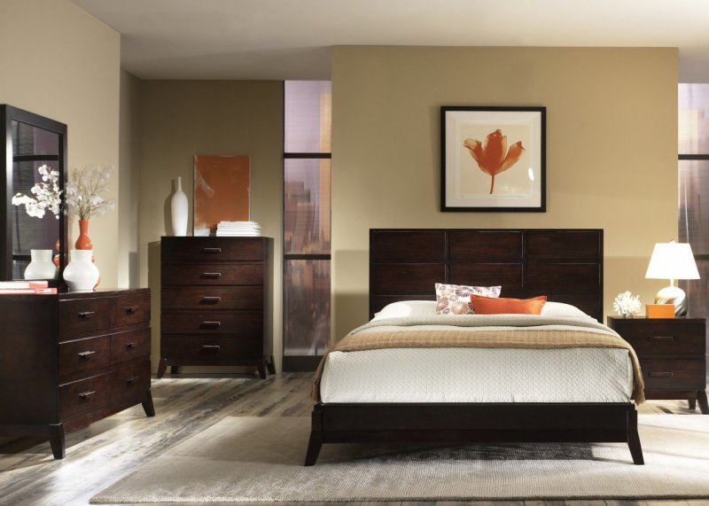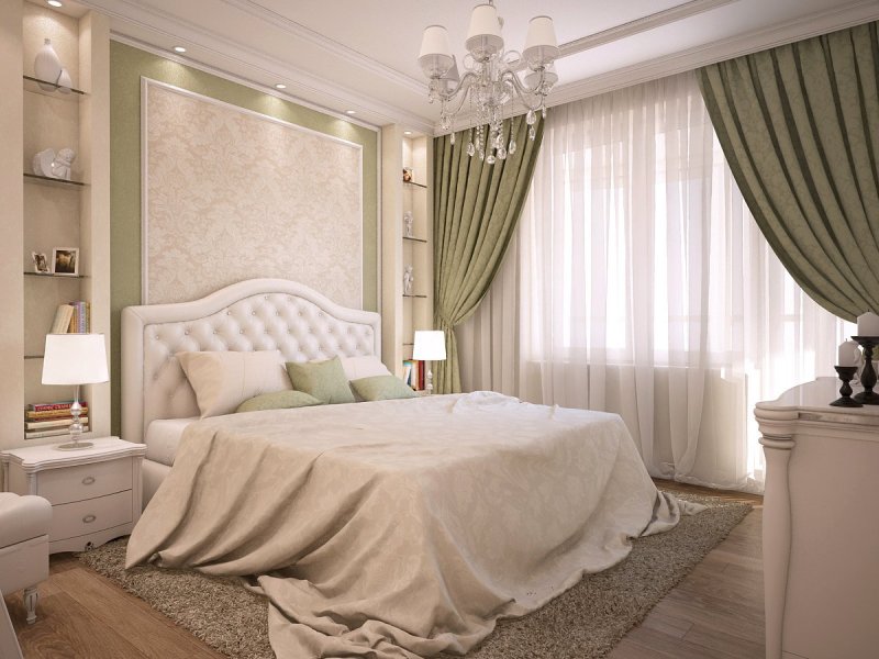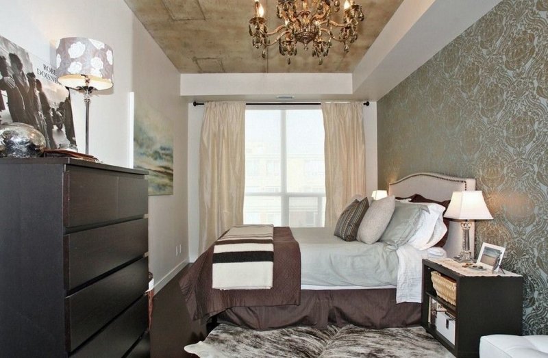 В комнате с шириной, ненамного превышающей длину кровати, разместить мебель можно только несколькими вариантами. Спальное место располагают боком к стене (если одна из них длиннее — то рядом с более длинной). С другой стороны будет более-менее свободный проход. В зависимости от общего размера помещения, один или два торца кровати оставляют свободными. Изножье, например, может вплотную примыкать к какой-то из стен или к окну. Но есть и альтернативный вариант, при котором изголовье приставлено к стене рядом с дверным проемом. Неудобств с обустройством односпальной кровати не будет, а вот с двуспальным местом связаны некие трудности, так как кому-то придется перелазить через лежачего или ложиться со стороны изножья. Если места на проходы нет вообще, то спальную мебель ставят в самом конце помещения, в большинстве случаев — возле окна, изножьем к дверному проему.