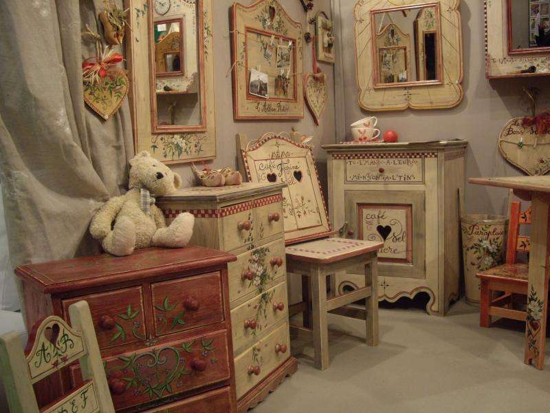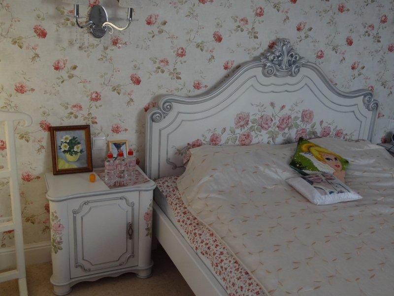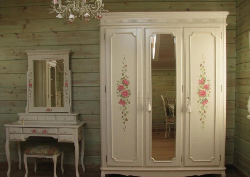 Шебби-шик. Характеризуется нежными пастельными тонами. Используется реставрированная старая мебель золотистых оттенков. Поверхности делают похожими на антиквариат, рисунок размыт с потертыми краями.