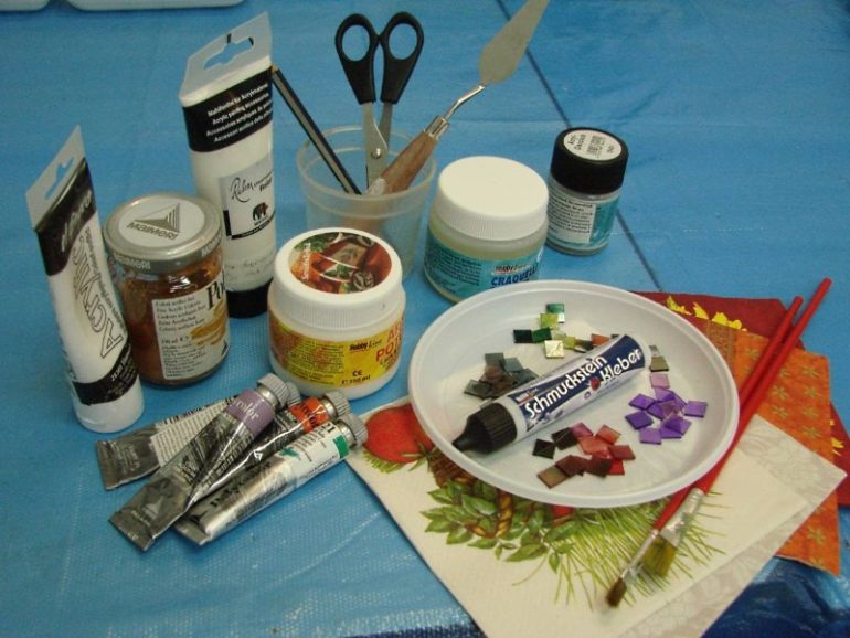 Важным пунктом в процессе декупажа мебели является подготовка всего необходимого для работы. От этого будет зависеть комфорт мастера, а также конечный результат. Для творчества понадобятся следующие инструменты: