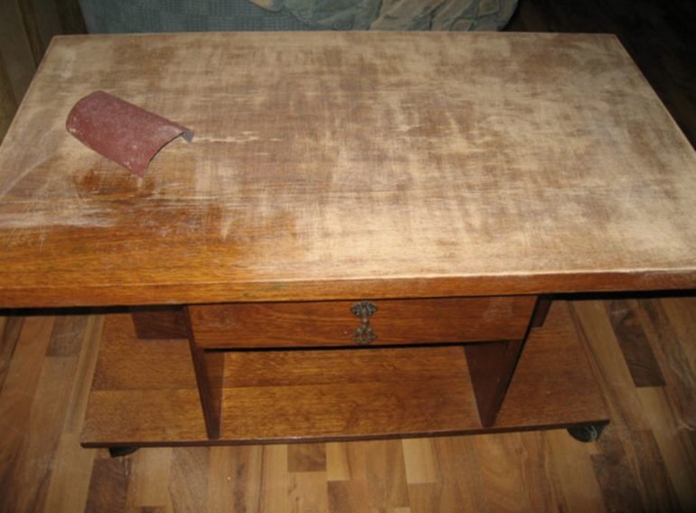 Очищаем все деревянные детали от старого лака и краски при помощи наждачной бумаги. Если стол из пластика, достаточно обезжирить спиртом.