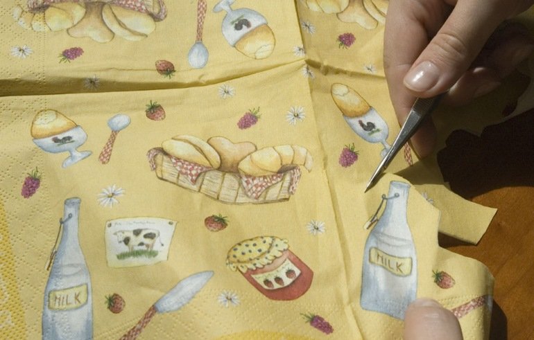 Салфетки – наиболее удобный материал для декупажа. Благодаря истонченной бумаге можно добиться незаметных переходов на общей поверхности. Лучше выбирать утонченные, романтические изображения в стиле прованс, винтаж. Пастельные тона создадут невообразимую атмосферу комфорта и спокойствия.