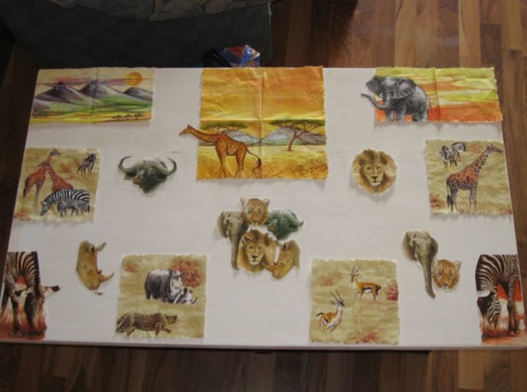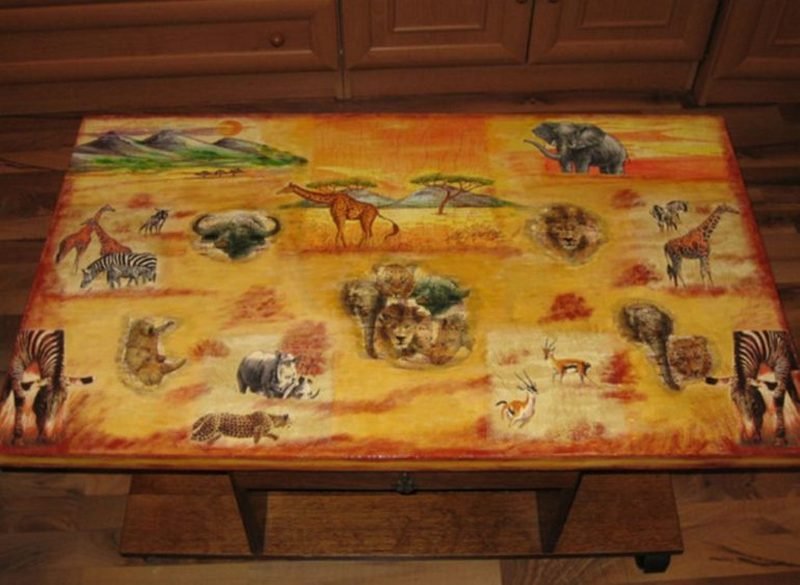 Декорировать журнальный столик можно в нескольких техниках. Самая популярная – декупаж салфетками. Специальные бумажные изделия можно купить с самыми разными мотивами (винтаж, тематические праздники, животные, природа, большие города и прочее). Также это могут быть вырезки из газет, журналов, географические карты, фотографии. Но следует учесть, что с плотным материалом сложней работать, перед фиксацией его необходимо истончить. Декорирование журнального столика в салфеточной технике проходит в несколько этапов: