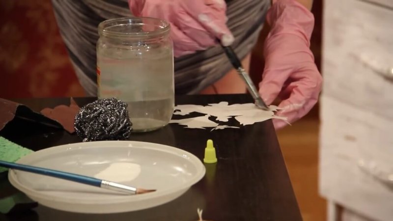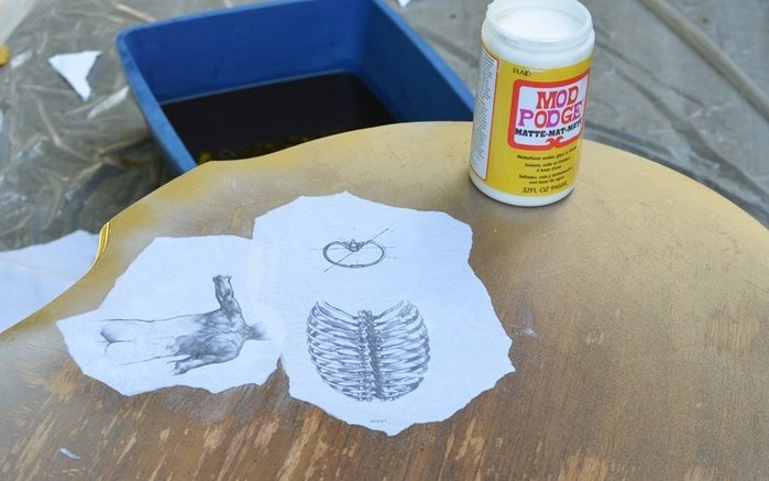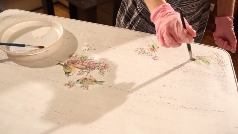После того как подготовительные работы выполнены, прикладываем отрезок обоев изображением вверх к поверхности столика. Перед началом фиксации картинку надо тщательно разгладить, убрать все заломы и неровности. Смешиваем клей с водой и размазываем его по всей площади бумажного элемента.