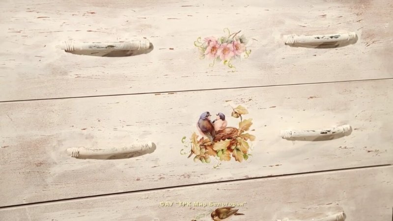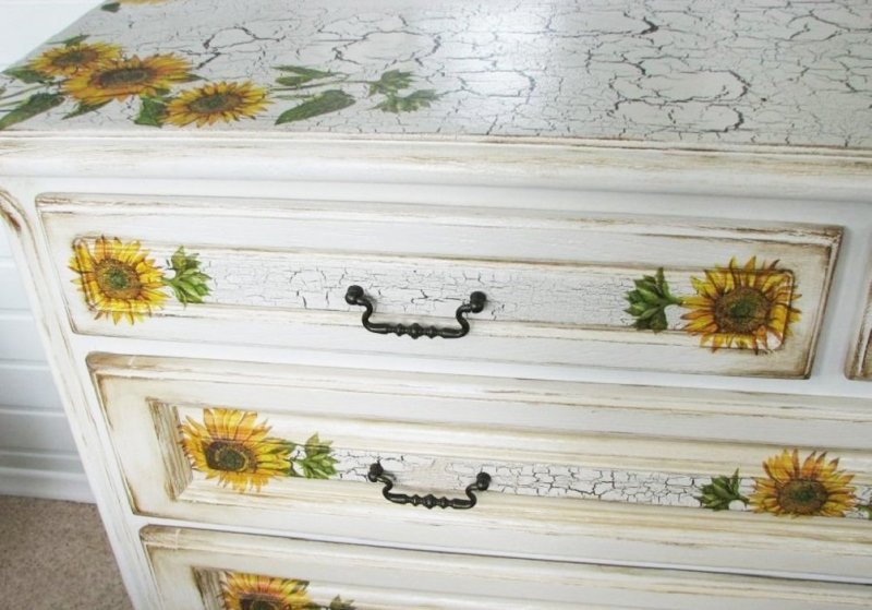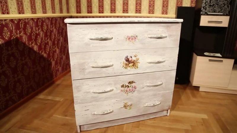 Очень популярный вариант реставрации комода под старину в стиле шебби шик. Это одновременное декорирование и состаривание. Простой декупаж с помощью салфеток можно выполнить на любой окрашенной поверхности, но лучше, если она будет белой, розовой, салатной, голубой или бежевой.