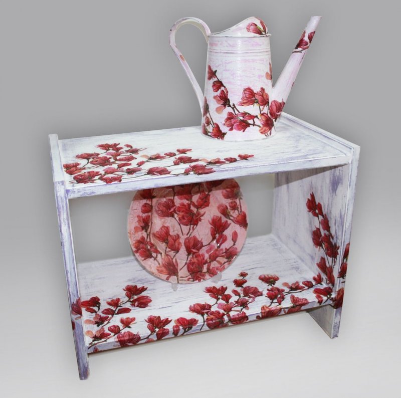 Зародившаяся в раннем Средневековье декоративная техника получила популярность в 17 веке в еще независимой на тот момент Венеции. Само слово заимствовано с французского языка. Как и любое творчество, декупаж мебели позволяет создать художественный образ, а искусное выполнение дела сделает любой непривлекательный, скучный предмет неотъемлемой частью убранства в доме. Заниматься искусством может каждый. Для этого необходимо подобрать вещь для декупирования, придумать сюжет, подготовить рабочие инструменты. Но, чтобы превратить изделие в настоящий шедевр, следует разобраться в разных методах, стилистической направленности, особенностях декорирования. Содержание Преимущества и недостатки использования декупажа для мебели Методики техники декупаж Стилистические направления декупажа Необходимые материалы и инструменты Особенности декупажа для полированной мебели Особенности декупажа пластиковой мебели Как подготовить поверхность мебели Мастер-классы по обновлению мебели Декупаж обеденного стола цветными обоями Украшения для журнального столика Реставрация комода салфетками Декупаж кухонного гарнитура Декупаж табурета Применение декупажа для украшения кровати Идеи декупажа шкафа Декупаж мебели тканью Заключение Преимущества и недостатки использования декупажа для мебели Обновление старых вещей, как и украшение новых, казалось бы, довольно сложная задача. Мастер должен продумать все до мельчайших подробностей, чтобы рассматриваемый предмет точно вписался в существующий интерьер, не противоречил ему. Однако, вся сложность заключается лишь в выборе соответствующего изображения. Поэтому основным преимуществом данной техники можно назвать ее простоту, а также: для работы потребуется минимальный набор инструментов и материалов; вид творчества не требует специальных навыков, доступен каждому; небольшие затраты на декупажные карты, газетную бумагу, ткань; экономия бюджета, не требуется покупка новой мебели; самостоятельный выбор рисунка, отвечающий личным пожеланиям; появляется возможность превратить обычные повседневные вещи в уникальные, красивые изделия. Из недостатков этого творчества можно выделить: приклеенные материалы неустойчивы к механическим повреждениям; работа может отнять много времени; поверхность с готовым изображением нельзя тереть жесткими мочалками, применять при уборке моющие средства; качество зависит от выбранного сырья. Методики техники декупаж Разнообразие материалов, используемых в творческом процессе, позволяет украшать любые поверхности: дерево, стекло, металл. Применение различных техник дает безграничные возможности для проявления фантазии. Среди существующих видов декупажа можно выделить: Прямой (классический). Самый распространенный тип. Работа заключается в грунтовке и окрашивании поверхности, наклеивании рисунка, использовании декоративных приемов, нанесении финишного покрытия. Обратный. С помощью этого метода декорируют прозрачные пластиковые, стеклянные предметы. Процесс тот же что и в первом случае, только выполняется в обратном порядке. Изображение клеится лицевой стороной на стекло, после проделываются стандартные действия. Объемный. Изготавливаются самостоятельно путем наклеивания на основную картинку копий отдельных фрагментов, которые станут 