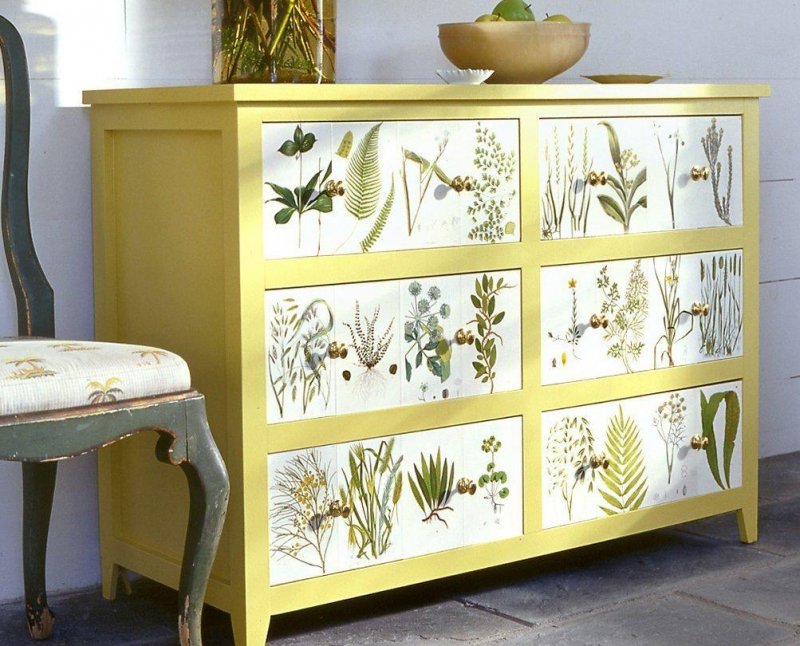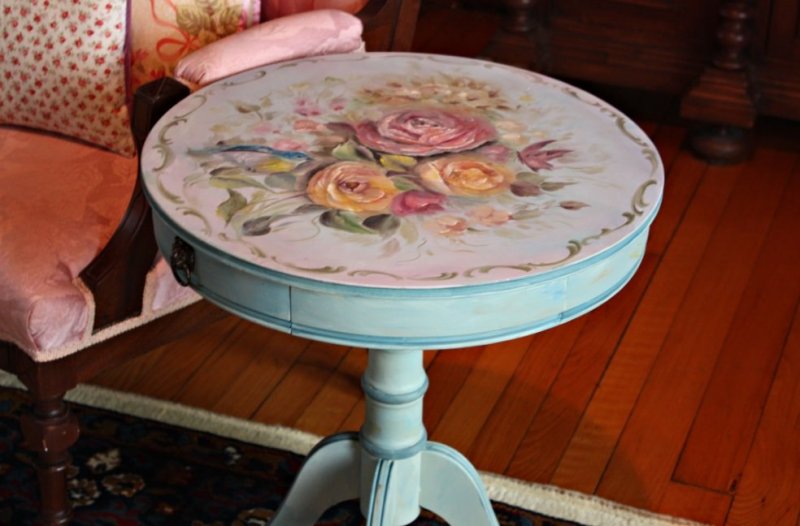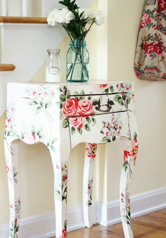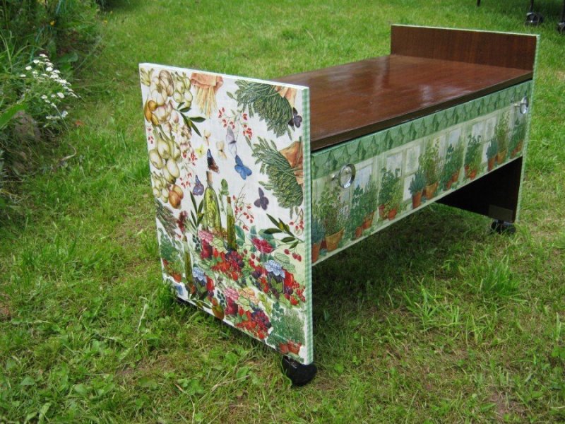 Новое интересное направление – декупаж мебели тканью. При работе можно использовать любые комбинации, сочетать разные тематики и цвета. Потребуются всевозможные лоскутки, клей, лак, губка и кисточки.
