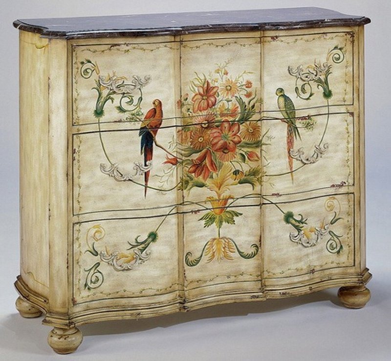Первым делом старый комод надо покрасить. Это может быть акриловая краска или на основе цветного мела. Опытные мастера рекомендуют использовать второй вариант, поскольку, по их мнению, она ровней ложится. Работать можно широкой кистью или валиком.