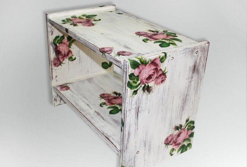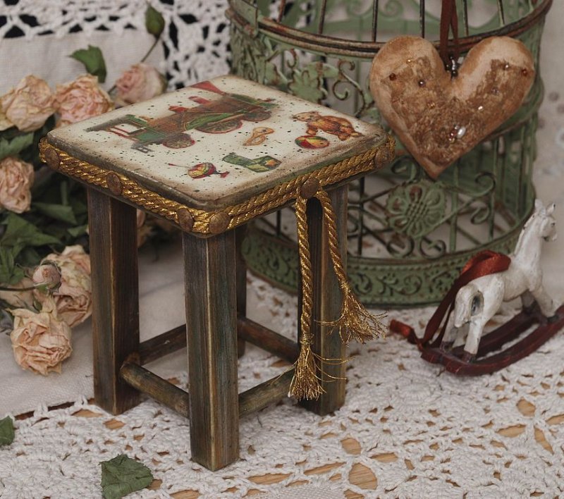 Декорировать табурет можно в любом стиле. Главное, чтоб обновленный дизайн вписывался в общий интерьер комнаты. Это может быть прованс, винтаж, газетная техника или использование ткани. Начинать работу следует с тщательного подбора цвета. Он не должен отличаться от основного фона стен, гарнитура или другой габаритной мебели. Теперь распечатываем салфетки с выбранным рисунком.