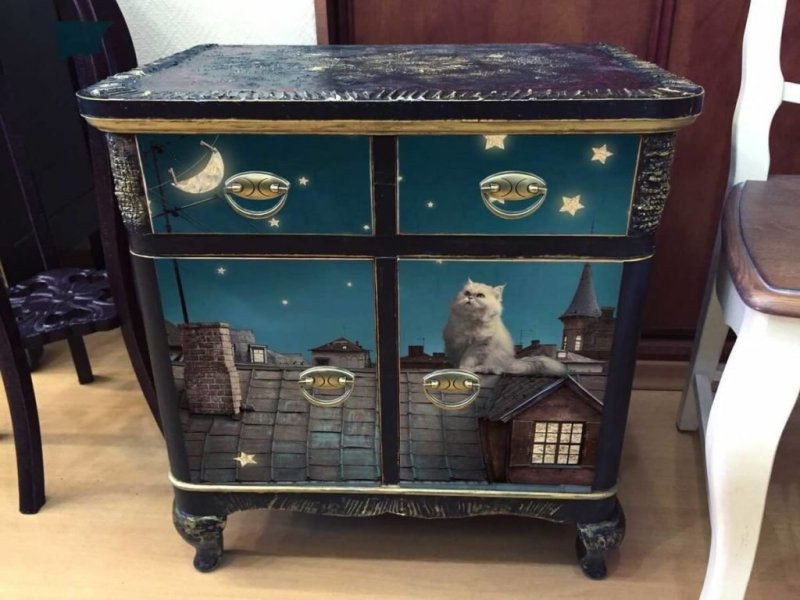 Зародившаяся в раннем Средневековье декоративная техника получила популярность в 17 веке в еще независимой на тот момент Венеции. Само слово заимствовано с французского языка. Как и любое творчество, декупаж мебели позволяет создать художественный образ, а искусное выполнение дела сделает любой непривлекательный, скучный предмет неотъемлемой частью убранства в доме.