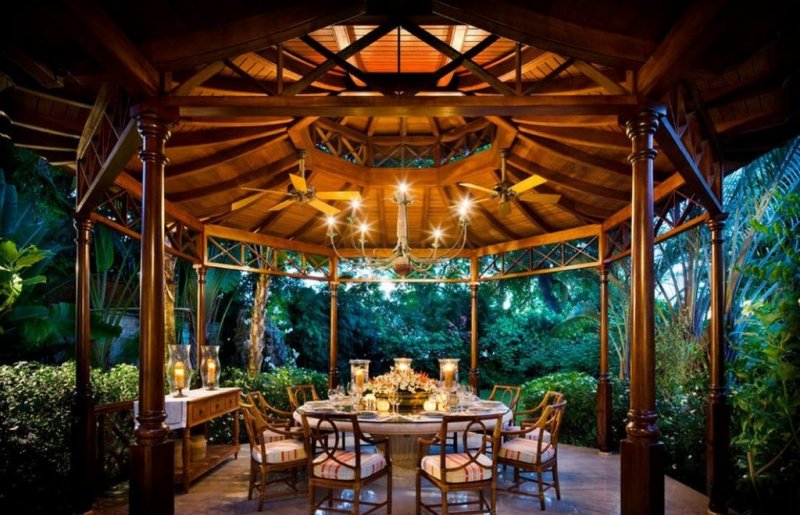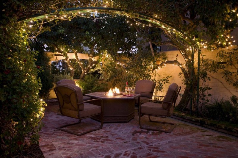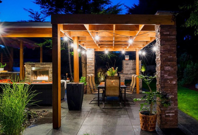 декоративные гирлянды: уличные гирлянды могут развешиваться под потолком по периметру навеса, обматываться вокруг отдельно расположенных столбов-опор металлических и деревянных беседок;