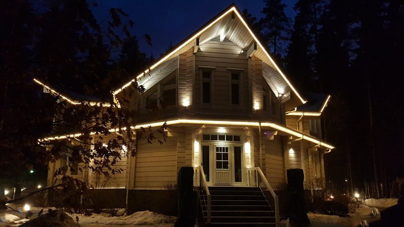 Для создания такого освещения загородных коттеджей устанавливаются специальные светильники, которые практически не видны. Они обычно оснащаются глубоким корпусом и яркими лампами. Монтируются на фасаде для улучшения внешнего вида постройки, силуэтного выделения отдельных частей.