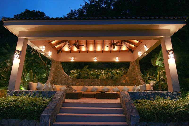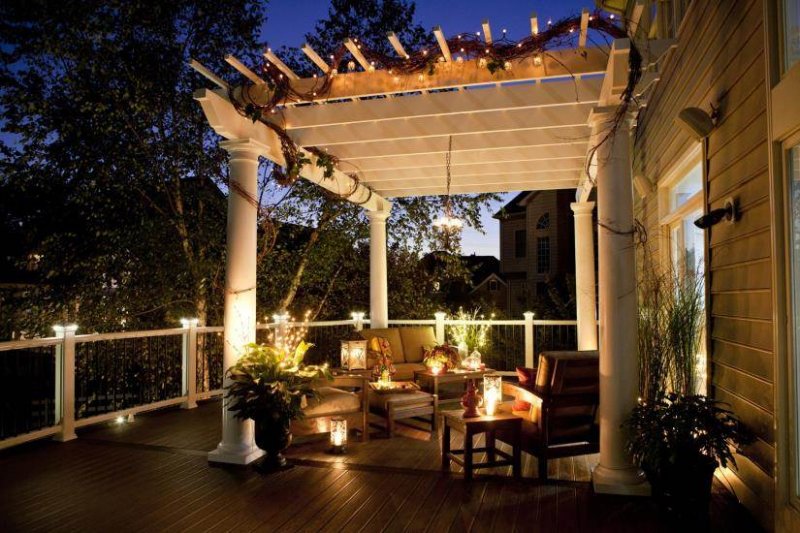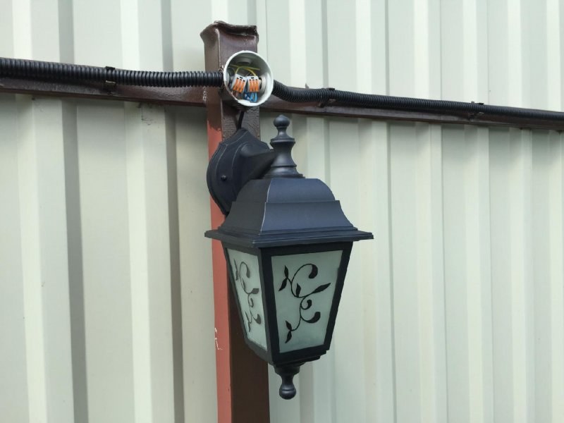 В верандах, пристроенных к самому дому, зачастую устанавливается несколько потолочных светильников. Также их могут заменить настенные модели, имеющие вид уличных бра (фонари, полусферы). Прокладка проводов осуществляется непосредственно от дома. В случае с освещением удаленных от основной постройки беседок можно использовать такие варианты: