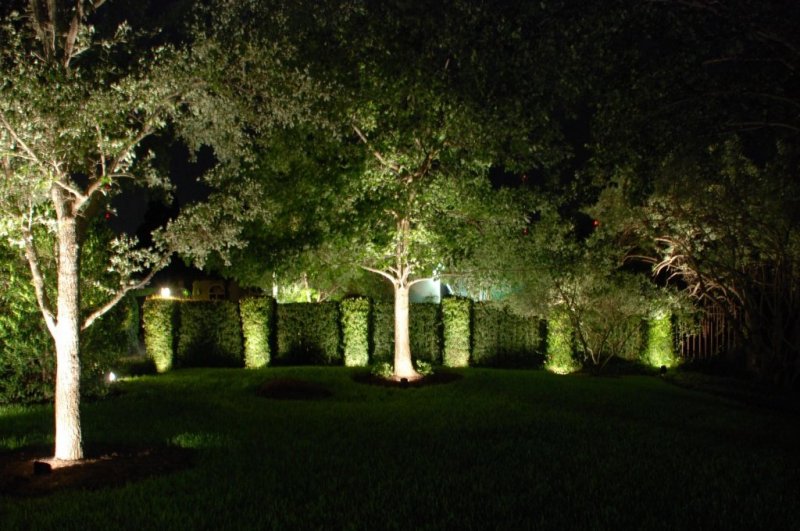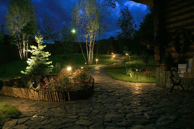 Создание необычного ландшафтного дизайна в просторном дворе предполагает установку светильников не только вокруг дорожек, но и возле кустарников, деревьев и клумб. Освещение деревьев и кустарников рекомендуется проводить с использованием мощных прожекторов.