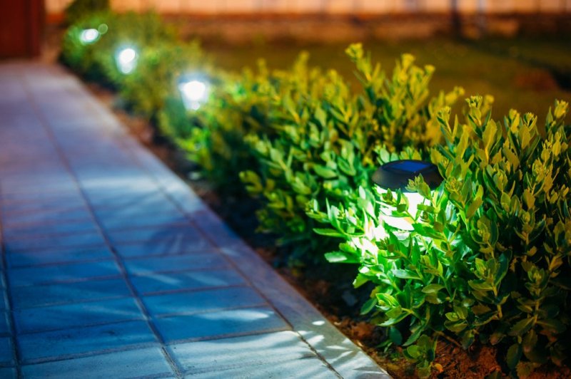 декоративные лампочки: точечные осветители, используемые для подсветки определенных участков (располагаются по периметру) или для точечного освещения сада (кустов, клумб);