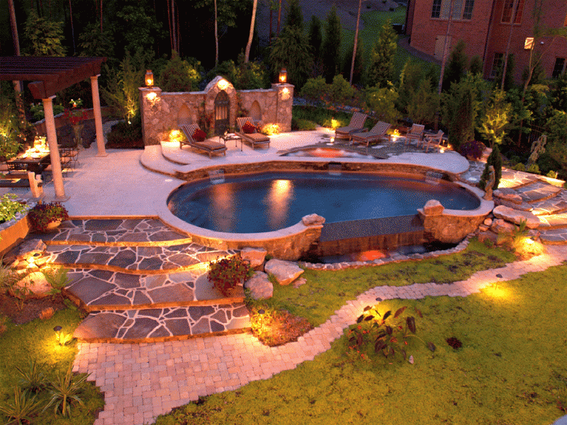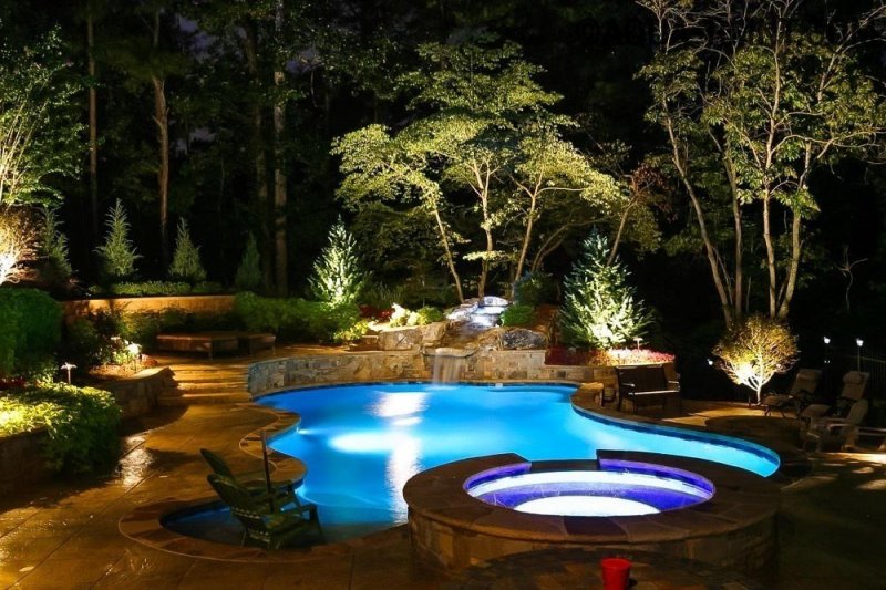 Вокруг бассейнов и искусственных водоемов организация подсветки осуществляется с использованием светильников, устойчивых к воздействию влаги. Они имеют герметичный корпус, предотвращающий попадание влаги к элементам питания или схемам прибора.