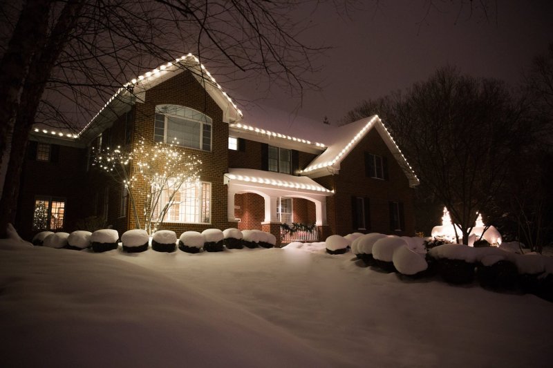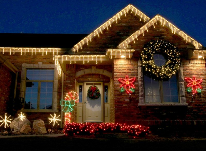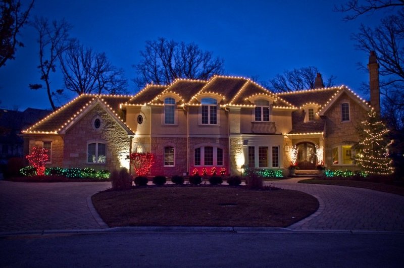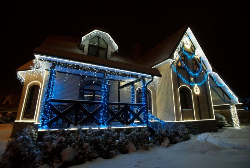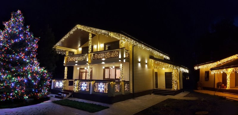 Ими можно полностью обматывать деревья или же использовать для стилизации фасада: располагать над оконными проемами, по периметру крыши. Для деревьев также могут использоваться гирлянды в виде тонких палок со светодиодами внутри.
