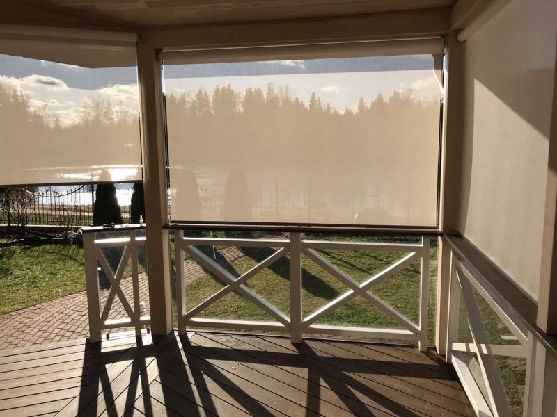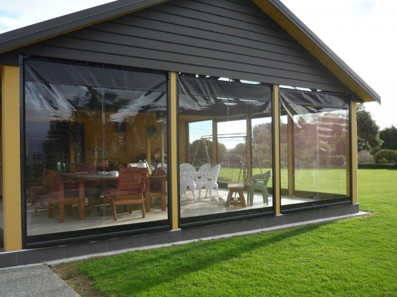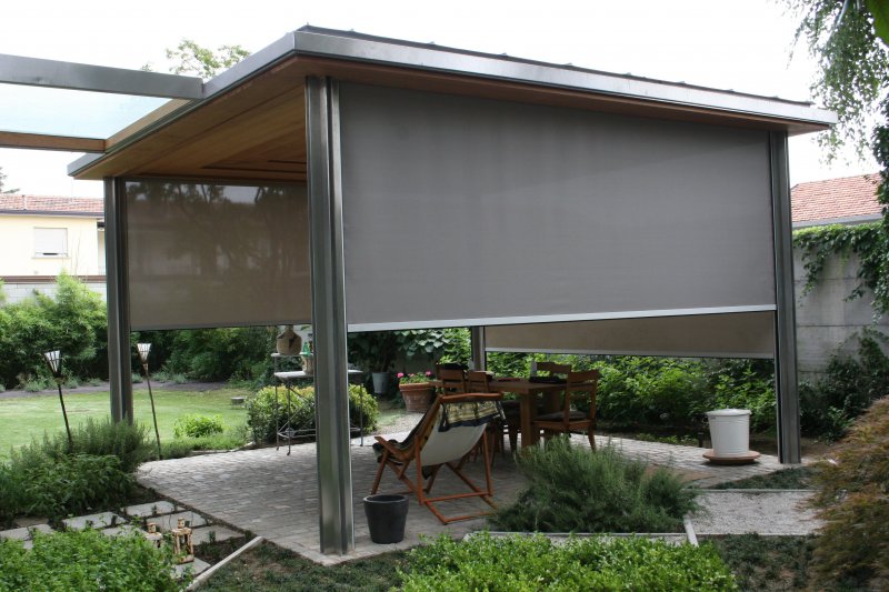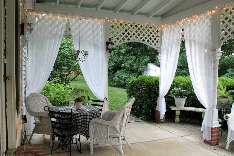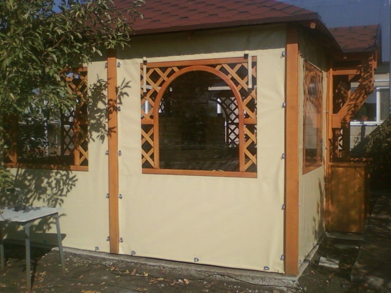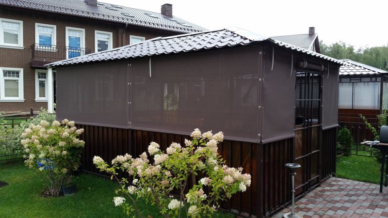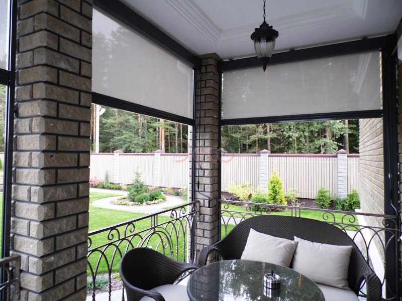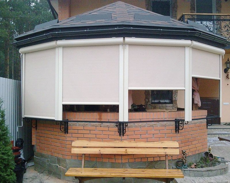 Можно по-разному обустроить веранды и беседки, как открытые, так и застекленные. Используют красивые тканевые, поливинилхлоридные, рулонные, и другие шторы. Изделия придают строению великолепный вид, подчеркивают его дизайн, совместимость с ландшафтом.