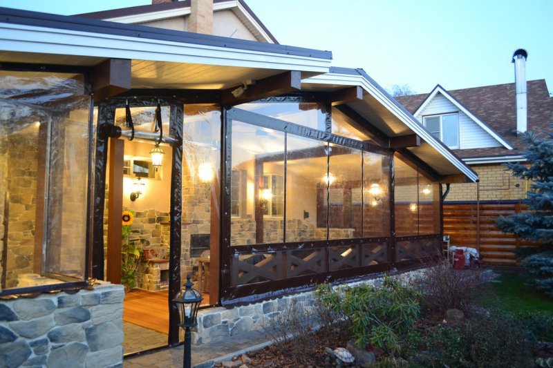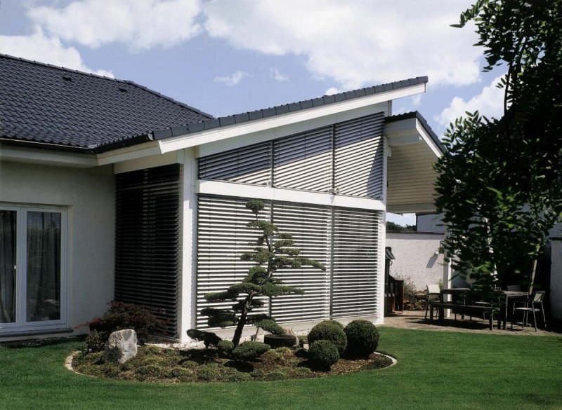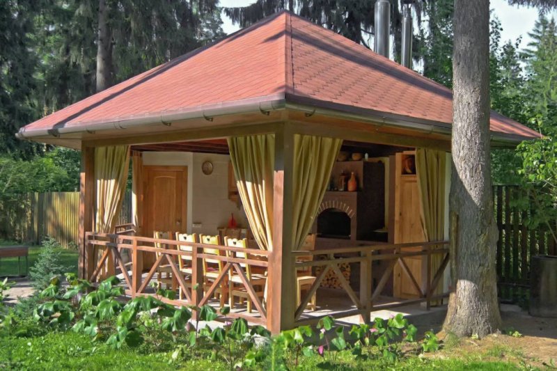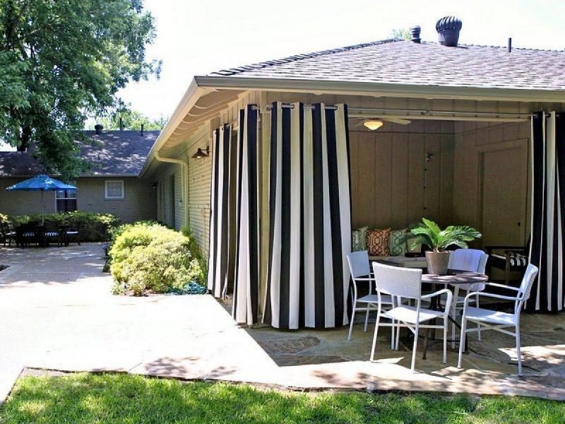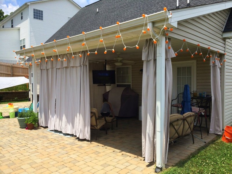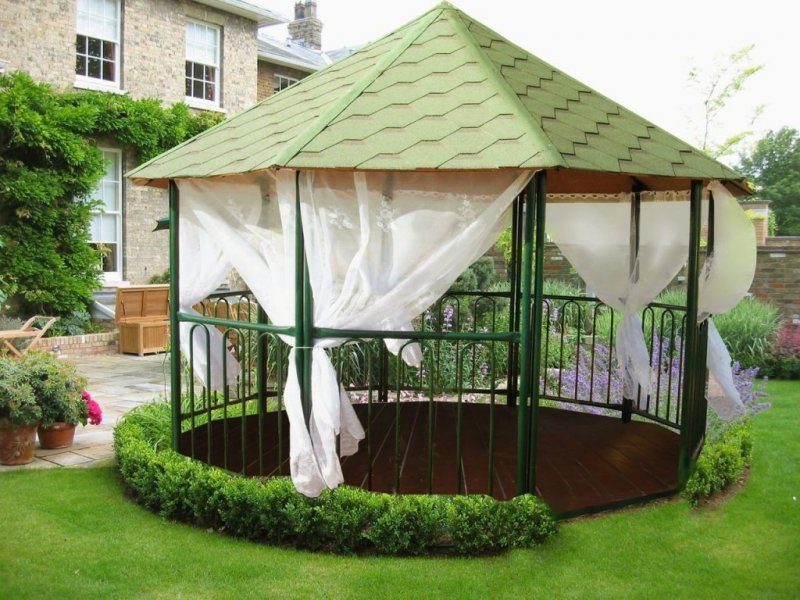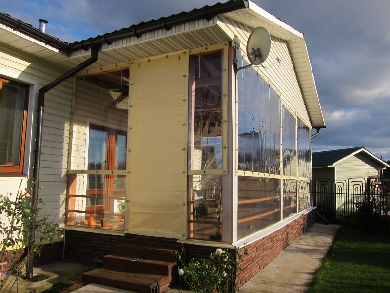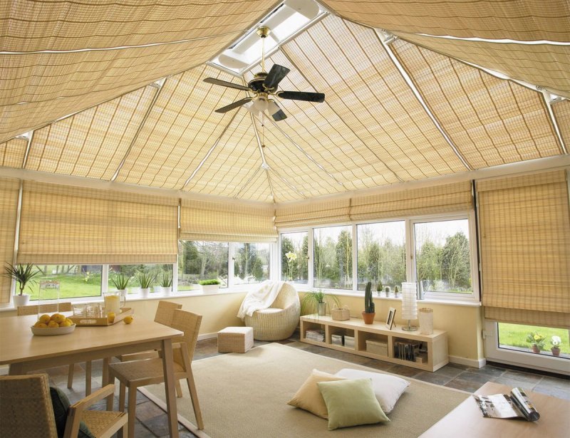 Можно по-разному обустроить веранды и беседки, как открытые, так и застекленные. Используют красивые тканевые, поливинилхлоридные, рулонные, и другие шторы. Изделия придают строению великолепный вид, подчеркивают его дизайн, совместимость с ландшафтом.