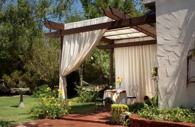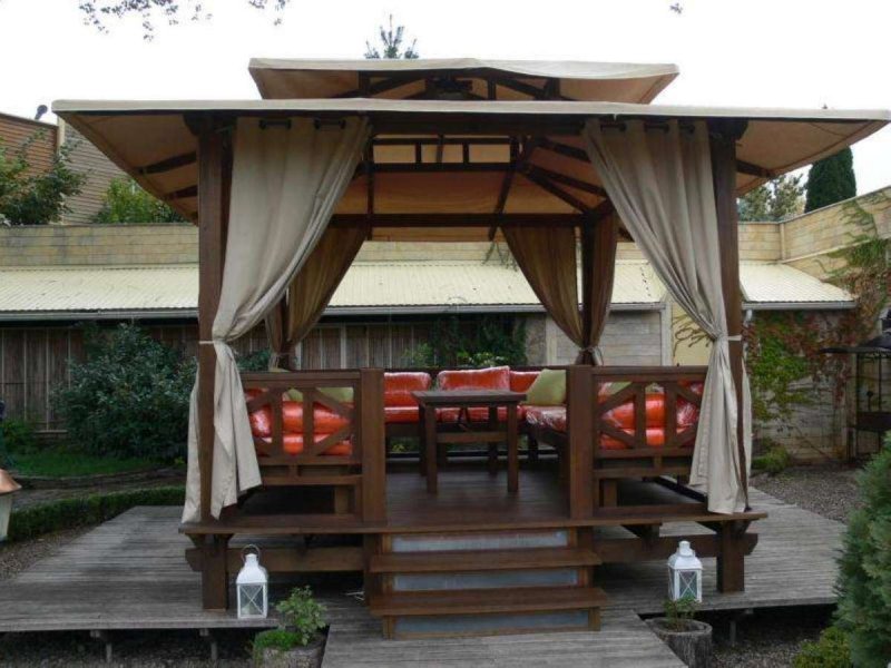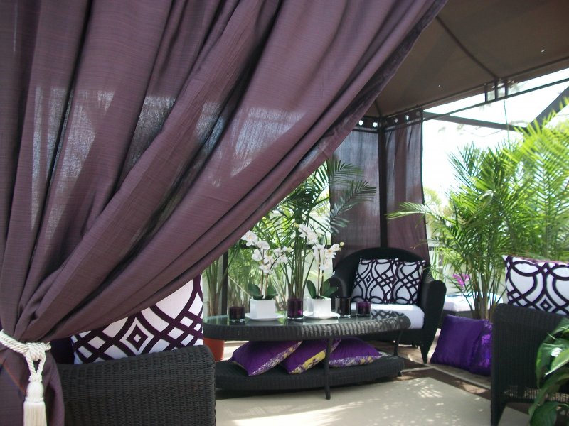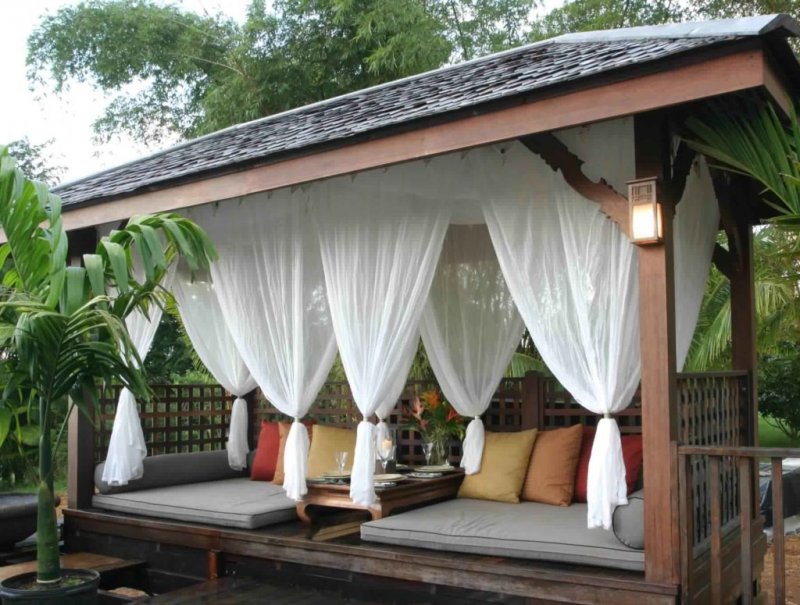 Уличные занавесы, изготовленные из привычного текстиля — хороший вариант для украшения садовых павильонов и веранд закрытого и открытого типа. Есть легкие, воздушные модели, в производстве которых используется шелк, шифон, более плотные варианты, выполненные изо льна или парусины. К положительным сторонам этих изделий можно отнести: