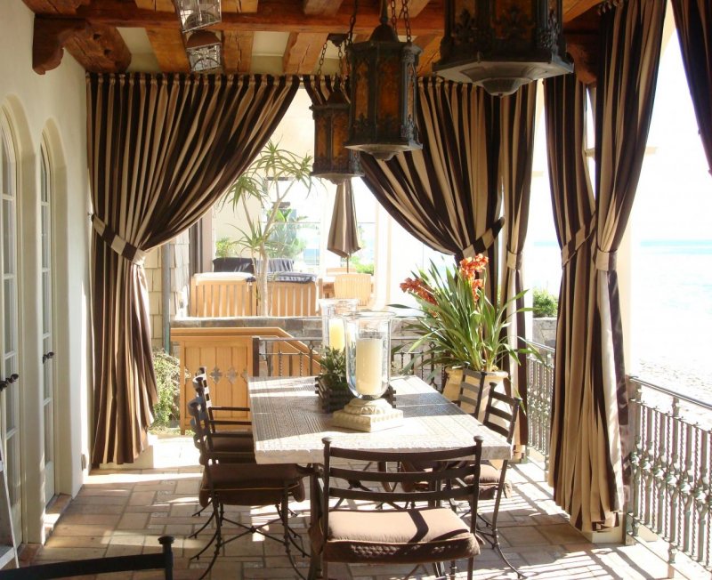 Оформляя дизайн веранды, следует подбирать такие модели уличных занавесов, которые украсят строение, защитят его от негативных воздействий окружающей среды. При этом сами изделия не должны терять свой внешний облик и структуру. Предъявляемые требования значительно сокращают виды сырья, используемого при изготовлении изделий, к тому же стоимость продукции существенно выше обычных штор.