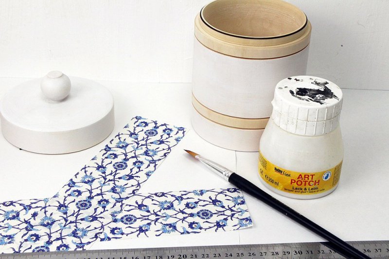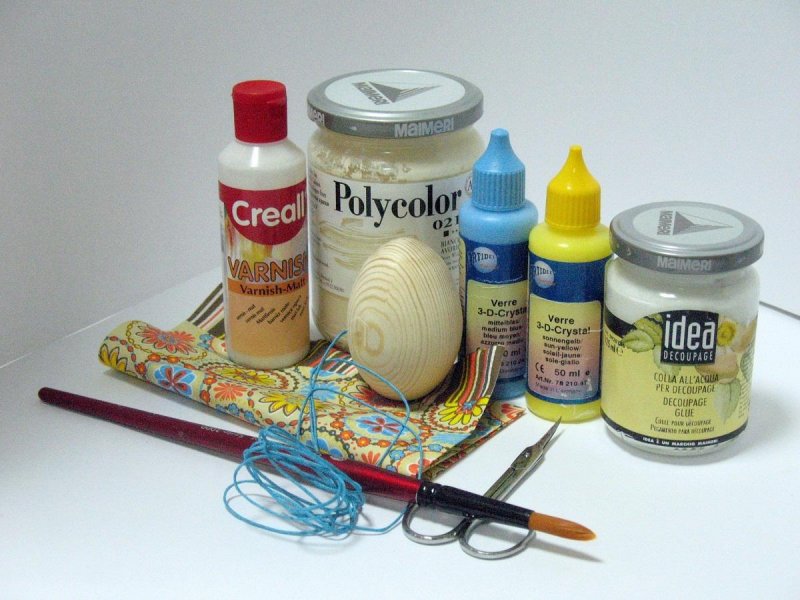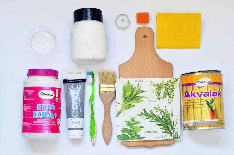 Клей. Есть специальные составы для декупажных работ, но они достаточно дорого стоят. Специалисты утверждают, что обычный ПВА ничем не уступает, он незаметен, хорошо склеивает компоненты.