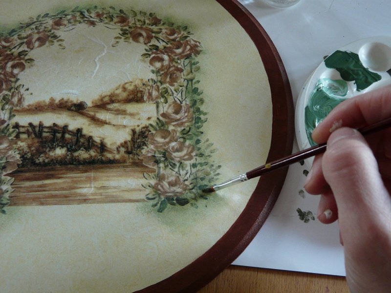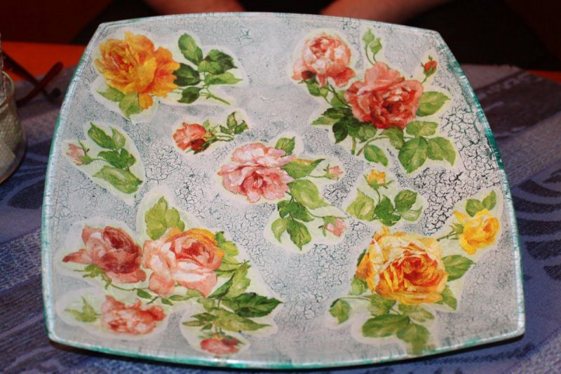 В этой технике можно преобразить простую стеклянную тарелку, превратив её в дорогое фарфоровое изделие. Это будет классический декупаж, но с обратной стороны. Для работы потребуется стандартный набор инструментов и материалов. Если необходимо искусственное состаривание, для нанесения «следов времени» можно использовать кракелюрный лак.