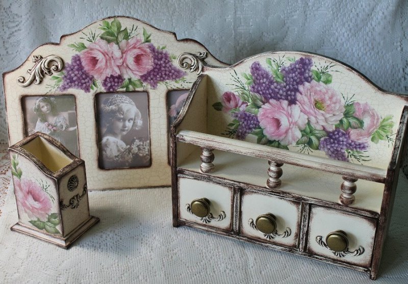 Старые вещи, спокойно пылящиеся на чердаке или в кладовке. Подготовив и задекорировав их поверхность.