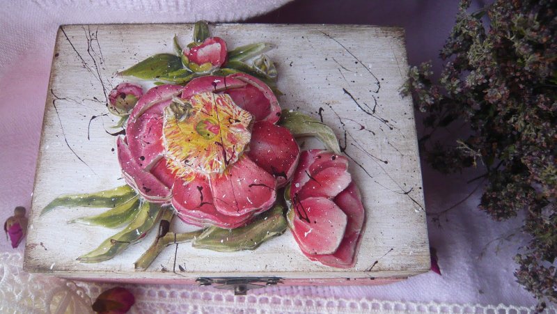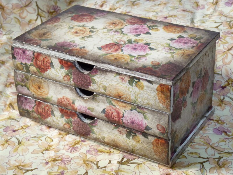 Дымчатый декупаж будет отлично смотреться на простой шкатулке. Сначала проводим стандартные процедуры по подготовке, зачищаем, обезжириваем все поверхности. Делаем обычное оклеивание подходящими картинками. Недостающие детали можно подрисовать акрилом. Теперь покрываем всю шкатулку лаком и оставляем сохнуть.