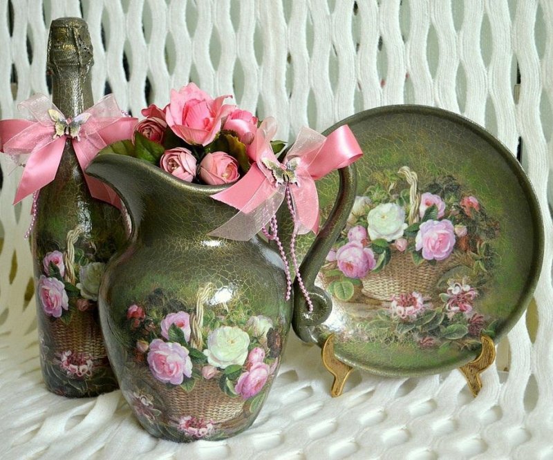 Способ нанесения салфеток часто применяется для декорирования закруглённых предметов, ваз, бутылок, горшков. Он является самым популярным и простым для начинающих. Таким методом можно создать оригинальную упаковку для напитков, украсить её тематически к празднику, любому торжеству.