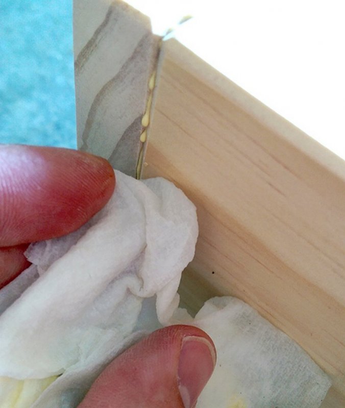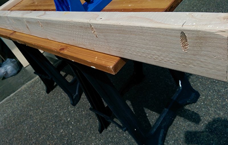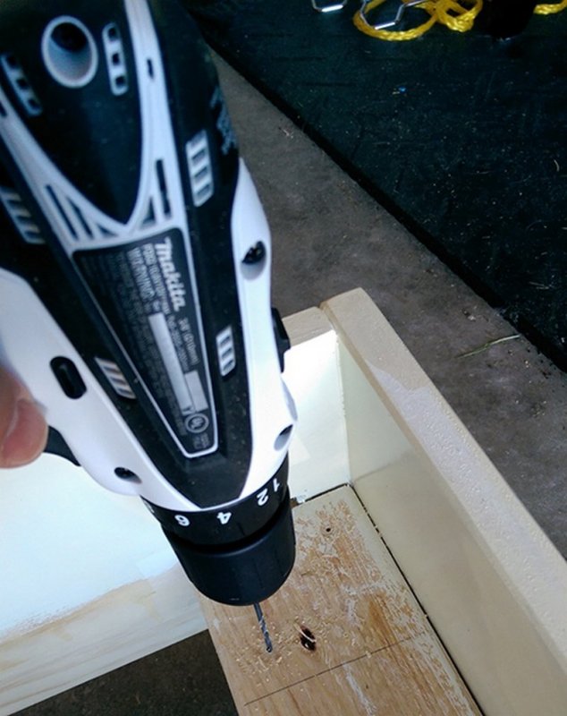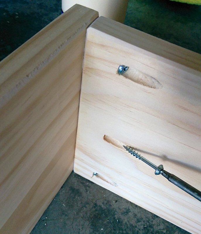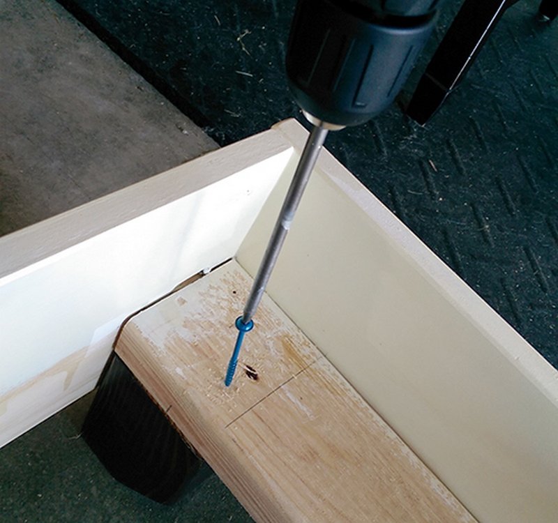 Работу начинают с изготовления рамы – саморезы, соединяющие доски, вкручиваются изнутри под определенным углом, с использованием приспособления Kreg Jig. Все неровности шлифуются, острые углы желательно слегка скруглить, торцы также обработать при помощи шлифовальной машинки. Потом места соединения смазываются клеем, доски скрепляются 30-миллиметровыми саморезами, излишки клея аккуратно удаляются сухой ветошью. Углы должны получиться идеально прямыми – это проверяется прикладыванием угольника к каждому из них.