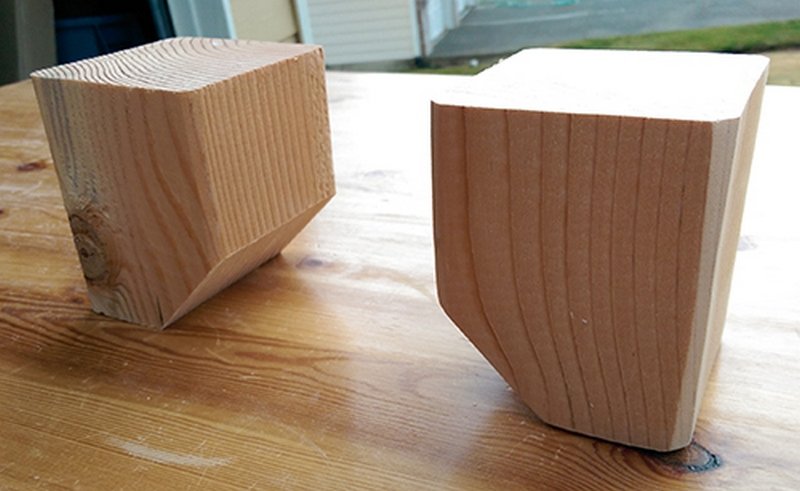 Ножки выполняются из шести почти квадратных брусков, высотой 105 мм., но при желании их допустимо сделать более высокими. Чтобы придать деталям красивую форму, на короткой стороне отмеряется 30 мм., на длинной – 50 мм., образовавшийся угол спиливается, острые кромки зашлифовываются.
