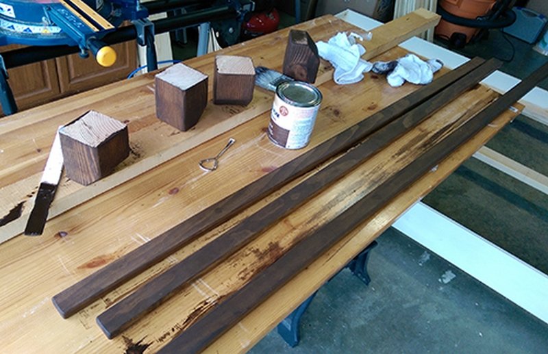 Простейший способ декорирования – окраска предварительно зашлифованных поверхностей. В данном случае морилкой темного колера тонируют декоративные рейки и ножки. Когда морилка высохнет, наносят полиакриловый лак. Далее детали шлифуются – обрезок бруска или доски оборачивается наждачной бумагой, после чего им обрабатывают все необходимое. Образовавшуюся пыль аккуратно стирают мягкой тканью, наносят еще два слоя лака.