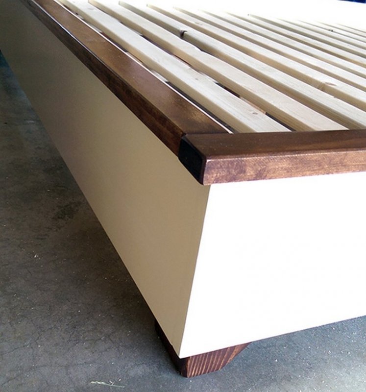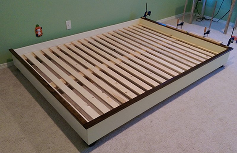 Чтобы изготовить опоры донышка кровати, в досках просверливаются направляющие отверстия – от края отступают 5 сантиметров, далее – через каждые 20-25 см. Когда каркас просохнет, его ставят набок, прикрепляют опорные бруски. Для этого при помощи регулируемого угольника чертят линию, отступив от нижнего края основания 50-55 мм. Столярный клей наносят волнообразно, на всю длину брусков, а также на торцы. Далее бруски закрепляются в нужных местах 50-миллиметровыми саморезами, каркас переворачивается, детали прижимаются струбцинами.