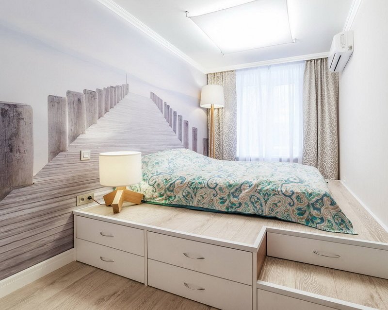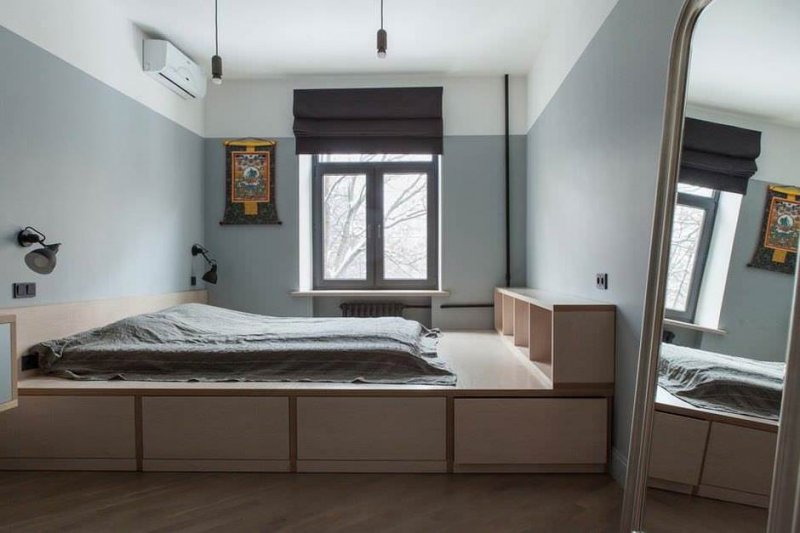 Высота подиума подбирается по своему усмотрению – чем выше потолок, тем большая конструкция допустима. Если нужно организовать дополнительные спальные места, в подиуме обустраивается выдвижная кровать, основная плоскость для сна находится на самом помосте.