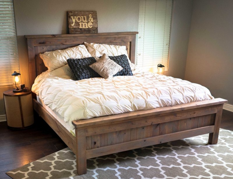 Дощатое изделие достаточно просто в сборке, занимает намного меньше места, чем из бруса, почти не уступая ему по прочности. Доски не должны иметь трещин, сколов, следов гнили, деформаций. Если так задумано, на кромках спинки и деталях изножья оставляют кору, которую обрабатывают тем же покрытием, что и всю конструкцию. Украшение резьбой, росписью, накладными элементами здесь также приемлемо.