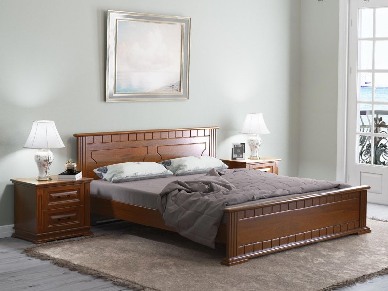 Наиболее часто используется клееный брус, выполненный из сосны. Каждая деталь склеивается из нескольких – из куска массива удаляют сучки, прочие дефекты, после чего разрезают на ламели, соединяя друг с другом при помощи клея. Такая мебель прочна, долговечна, наиболее часто украшается резьбой, роскошной обивкой, что хорошо смотрится в интерьерах классицизма, барокко, ампира. Детали из бруса – толстые, объемные, потому для размещения кровати потребуется немало места.
