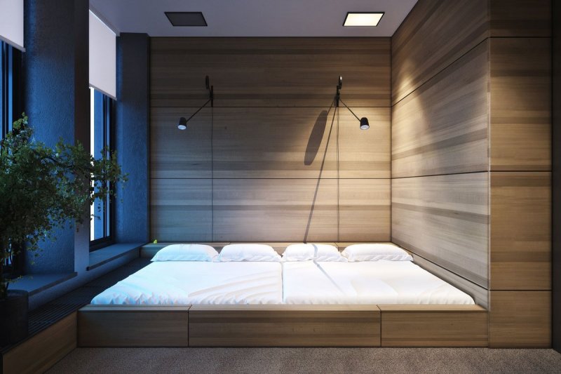 Конструкцию, расположенную на помосте, можно встраивать в нишу либо размещать у стены, по центру спальни, дополнять выдвигающимися ящиками, коробами для хранения постельных принадлежностей. Подиум состоит из каркаса, обшиваемого ОСБ-плитами, листами фанеры. Готовая верхняя плоскость не должна скользить – иначе матрас будет сползать с нее.