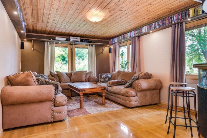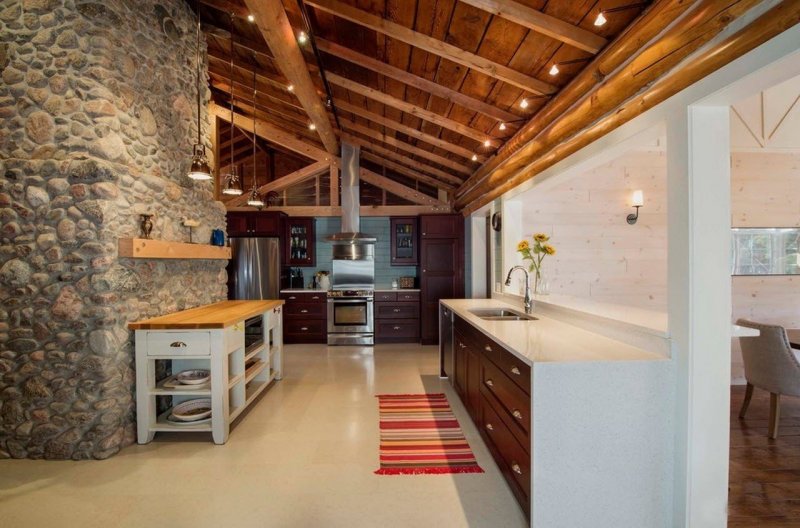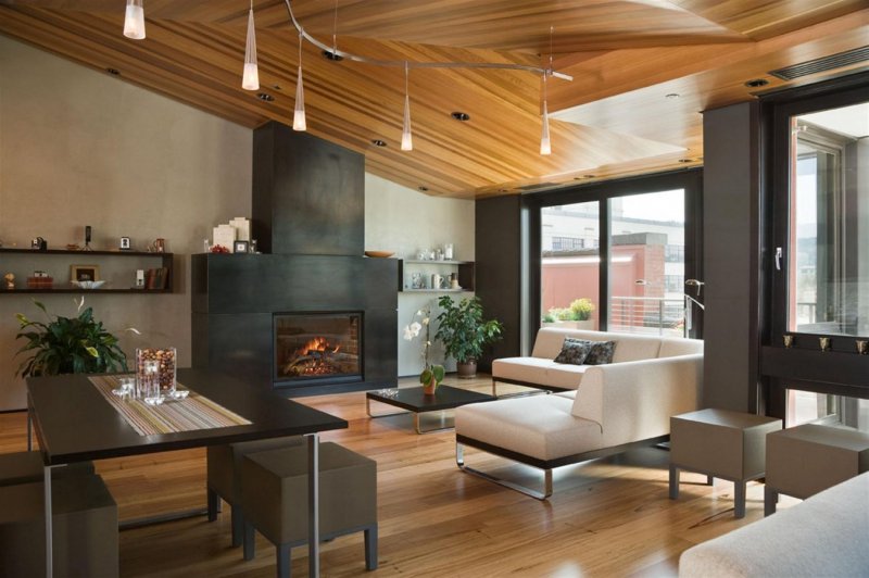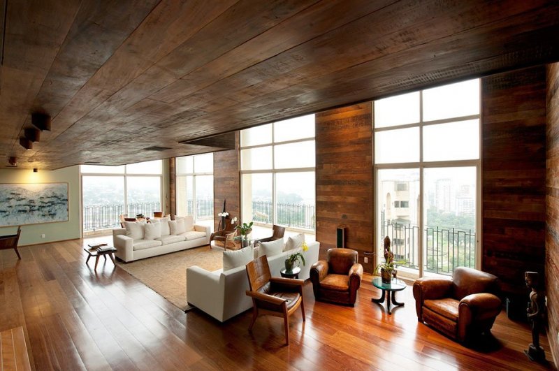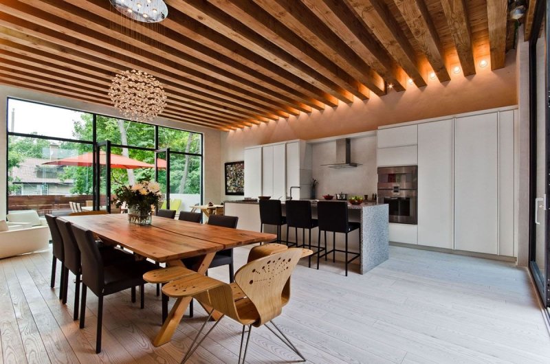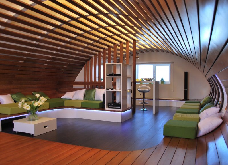 Натуральная древесина хорошо сохраняет тепло, создает атмосферу домашнего уюта. В помещениях с такими потолками всегда ощущается комфорт, витает неповторимый аромат. Многообразие естественных оттенков и фактур, податливость материала позволяет реализовывать самые смелые дизайнерские идеи.