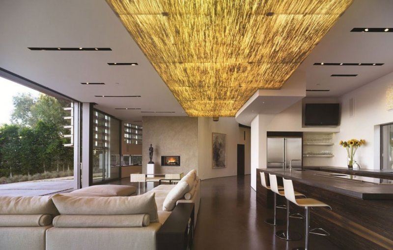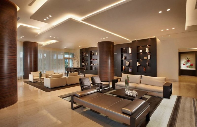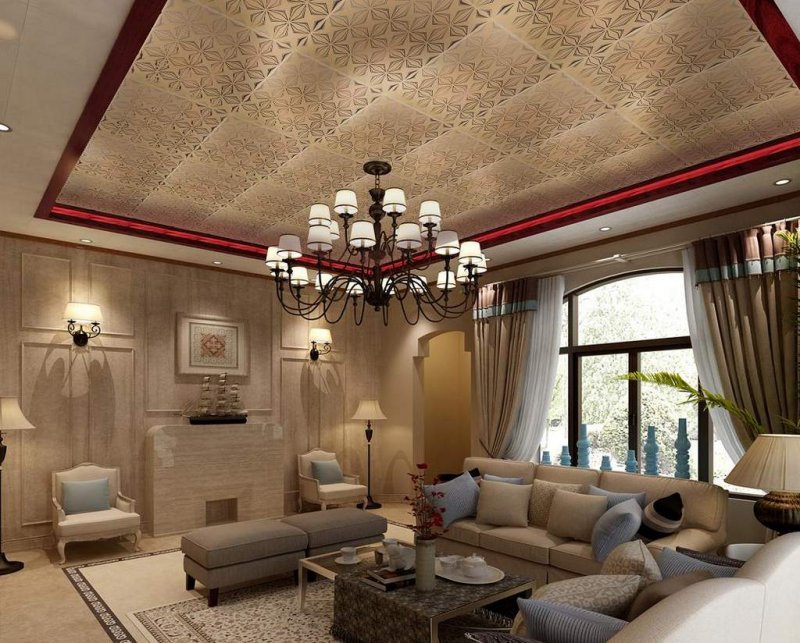 Выполняя ремонт в квартире, частном доме особое внимание следует обратить на отделку потолка. Часто к этому вопросу относятся халатно, не разобравшись в сути, выбирают невзрачные материалы, которые портят внешний вид интерьера. Тем не менее потолочное перекрытие имеет достаточно большую площадь, оказывает существенное влияние на восприятие комнаты в целом. При входе в любое помещение первым делом смотрят вверх, если пол и стены могут быть частично закрыты паласами, предметами мебели, то эта поверхность полностью находится на виду. Огромный ассортимент покрытий, имеющих различную текстуру, правильное освещение, цветовую окраску, позволяет значительно улучшить дизайн, повысить комфорт и уют. Профессиональные советы помогут разобраться в теме. Содержание Что учитывать при выборе материала для отделки потолка Площадь и высота потолков Назначение комнаты Стиль Количество ярусов Цветовая гамма потолков Популярные материалы и способы отделки потолков Побелка Окрашивание Декоративная штукатурка Обои Плитка из пенополистирола Натяжные потолки Бетонный потолок Варианты подвесных потолков Подвесной потолок из гипсокартона Реечный подвесной потолок Кассетный тип потолка Решетчатые потолки Грильято Подвесной потолок из ламината Зеркальные потолки Кессонная отделка потолков Отделка потолков текстилем Отделка натуральным деревом Оформление и отделка пробковым покрытием Отделка бамбуком Комбинированные способы отделки потолков Типы освещения и подсветки Заключение Что учитывать при выборе материала для отделки потолка Планируя оформление потолка, следует учитывать многие факты. Выбор покрытия зависит от располагаемых денежных средств, выделенных на закупку материалов и услуги специалистов. При наличии строительных навыков, необходимых для работы инструментов, на последнем пункте можно сэкономить, выполнить монтажные работы своими руками. Также стоит предусмотреть следующие моменты: габариты помещения, его площадь и высоту; вид комнаты, ее целевое предназначение; цвет потолочной обшивки, соответствующий общему оформлению; существующий стиль, выбранное направление в интерьере; целесообразность установки многоуровневых конструкций; наличие коммуникационных сетей. Потолочная облицовка служит не только в качестве украшения помещения. Она позволяет скрыть многие дефекты, визуально увеличить или уменьшить пространство, сэкономить на электроэнергии, в случае использования светоотражающих элементов. Площадь и высота потолков На выбор подходящего оформления оказывают влияние многие факторы, среди них габариты помещения, в котором производят ремонтные мероприятия. Остановимся на каждом параметре более подробно: Площадь. В доме каждая комната имеет разную площадь. От ее величины зависит количество необходимого для работы материала, соответственно его стоимость. В больших помещениях, таких как зал, будут органично смотреться многоуровневые гипсокартонные конструкции, разделяющие пространство на части. В тесной комнате можно использовать любую облицовку, а для улучшения визуального эффекта организовать скрытую светодиодную подсветку. Высота. В старых квартирах советской эпохи обычно делали невысокие потолки – 2,5 — 2,6 м, в новостройках это значение иногда достигает 3 м. В частном доме или на даче высота 