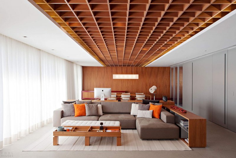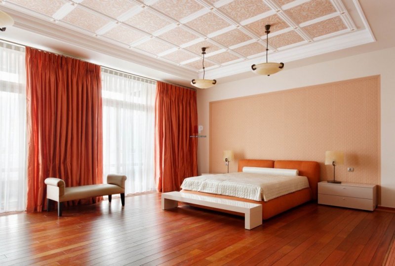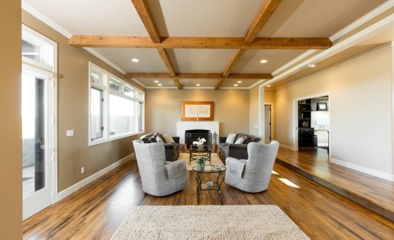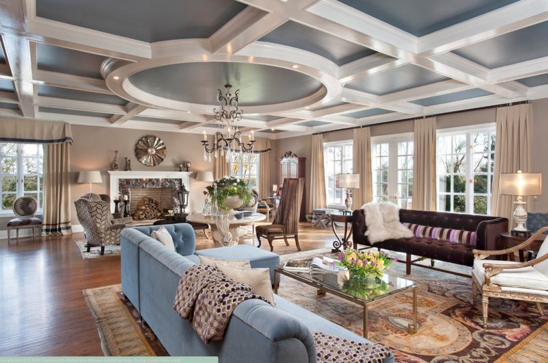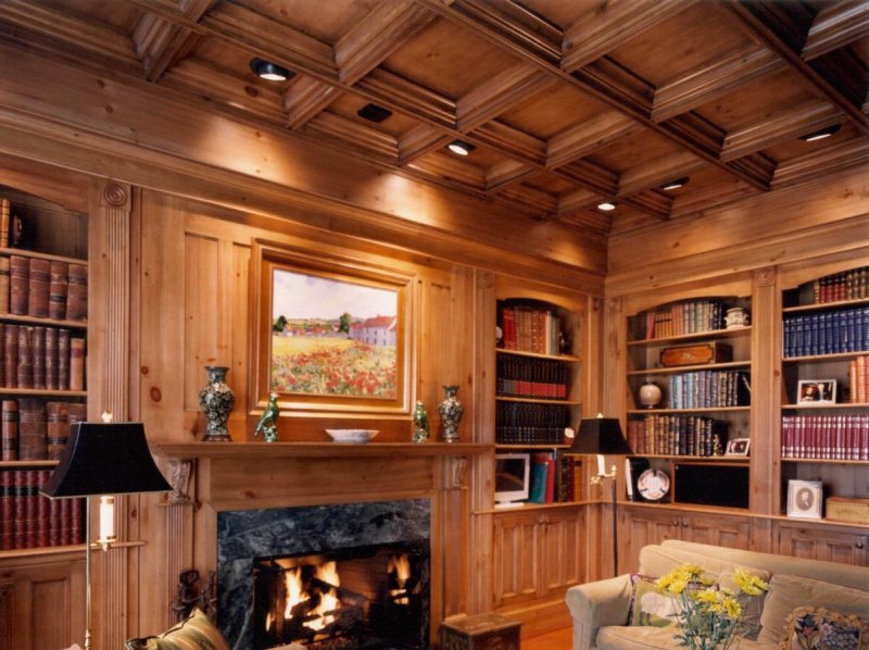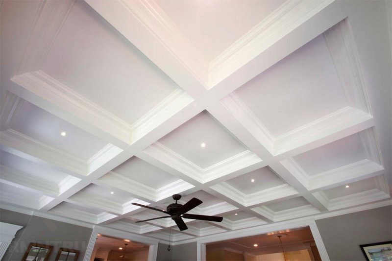 Сложная в исполнении, дорогостоящая конструкция впишется не в любой интерьер. Более уместно оформление будет смотреться в загородном доме. Не подходит для маленьких помещений с низкими потолками. Кессоны также бывают из гипсокартона, полиуретана.