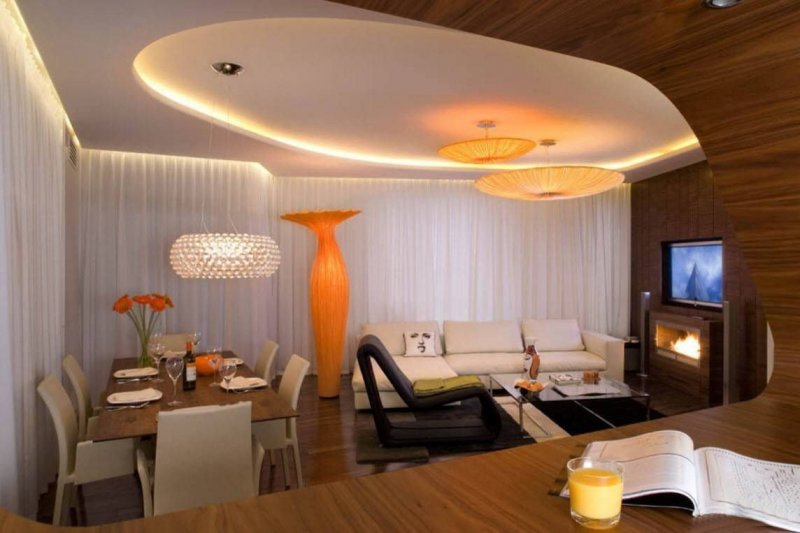 От формы и вида потолка зависит общее восприятие интерьера. Среди существующих вариантов хороший эффект производят многоярусные конструкции. Для создания таких покрытий походят не все материалы, их можно соорудить из: