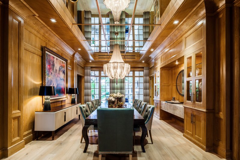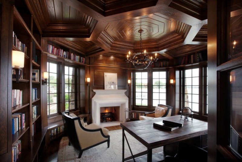 Английский. Для отделки можно использовать гипсокартонные конструкции с деревянным обрамлением, натяжные варианты с изображением, кессоны. Лучше применить натуральную древесину. В центре должна висеть большая люстра, в качестве дополнительного освещения устанавливают встроенные светильники. Допускаются светлые и коричневые тона, темно-серые.