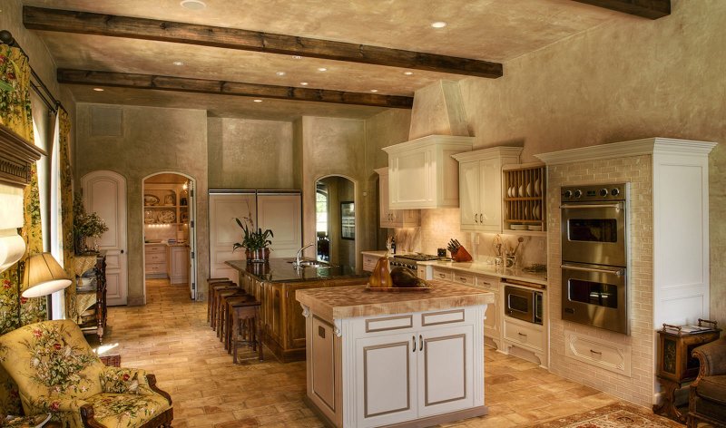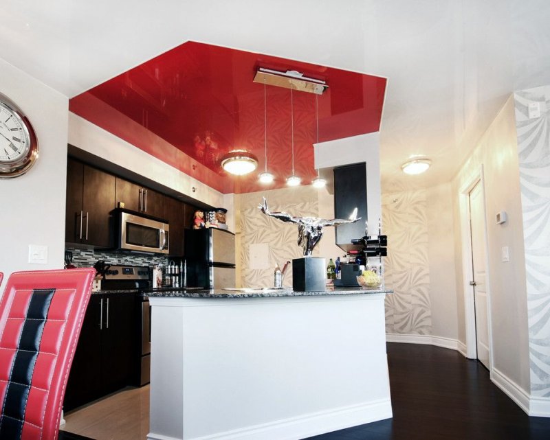 Кухня. Для этого помещения стоит учитывать большинство моментов, присущих ванной, устойчивость к повышенной температуре. Кухонная зона используется для приготовления пищи, к потолку постоянно поднимаются испарения, содержащие жир и масло, которые оседают на поверхности, разрушая ее.