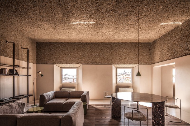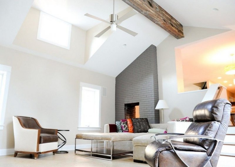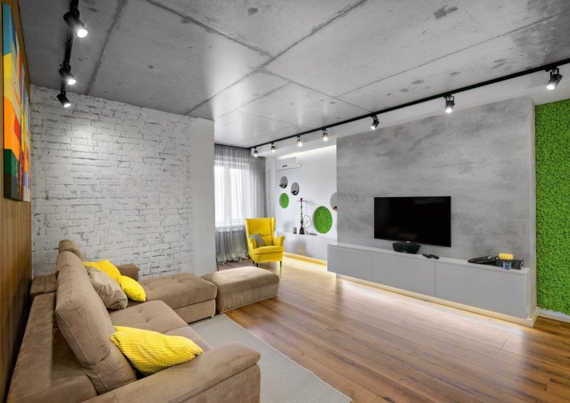 Лофт. Характеризуется высокими потолками с необработанными поверхностями, культом бетона. Для отделки достаточно очистить бетонное перекрытие от пыли, для декорации можно закрепить металлическую сетку. Чтобы завершить образ, подбираются декоративные коммуникации в виде искусственно состаренных деревянных балок, металлических труб. Также для облицовки используются обои, имитирующие кирпичную кладку. Характерны черный, белый, серый цвет с небольшим добавлением ярких акцентов.