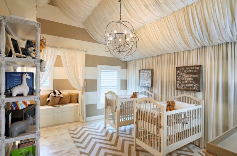 Драпировка. Для отделки потолка используют практически любую ткань. Благодаря разнообразию видов и фактур способ отделки подходит для любых интерьеров. Можно создавать невообразимые эффекты, делать интересные изгибы;