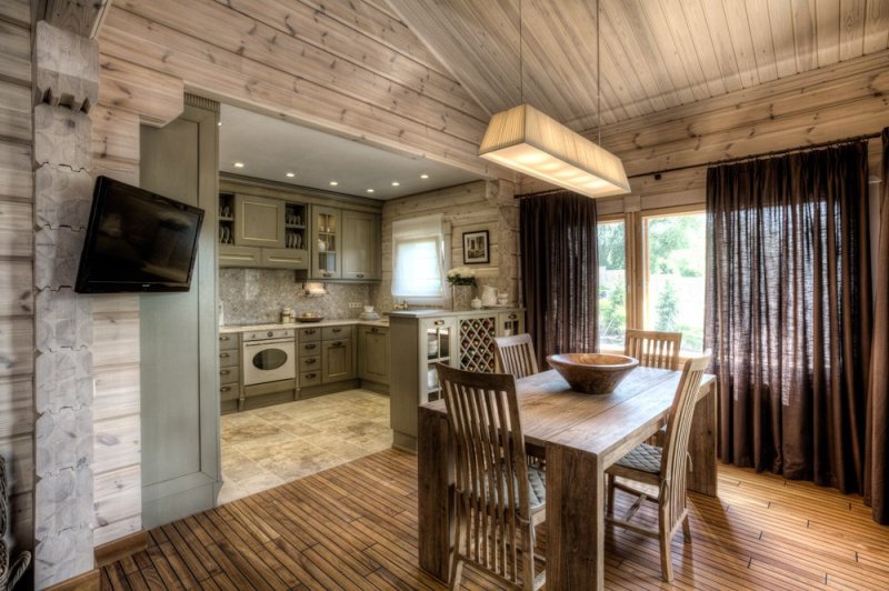 Отличный вариант для загородных домов – потолок из бруса. Особо прочный, долговечный материал обладает всеми характеристиками вагонки, по многим показателям ее даже превосходит. Из минусов можно отметить сложность монтажа, необходимость хорошей вентиляции. Также его придется периодически пропитывать специальными составами.